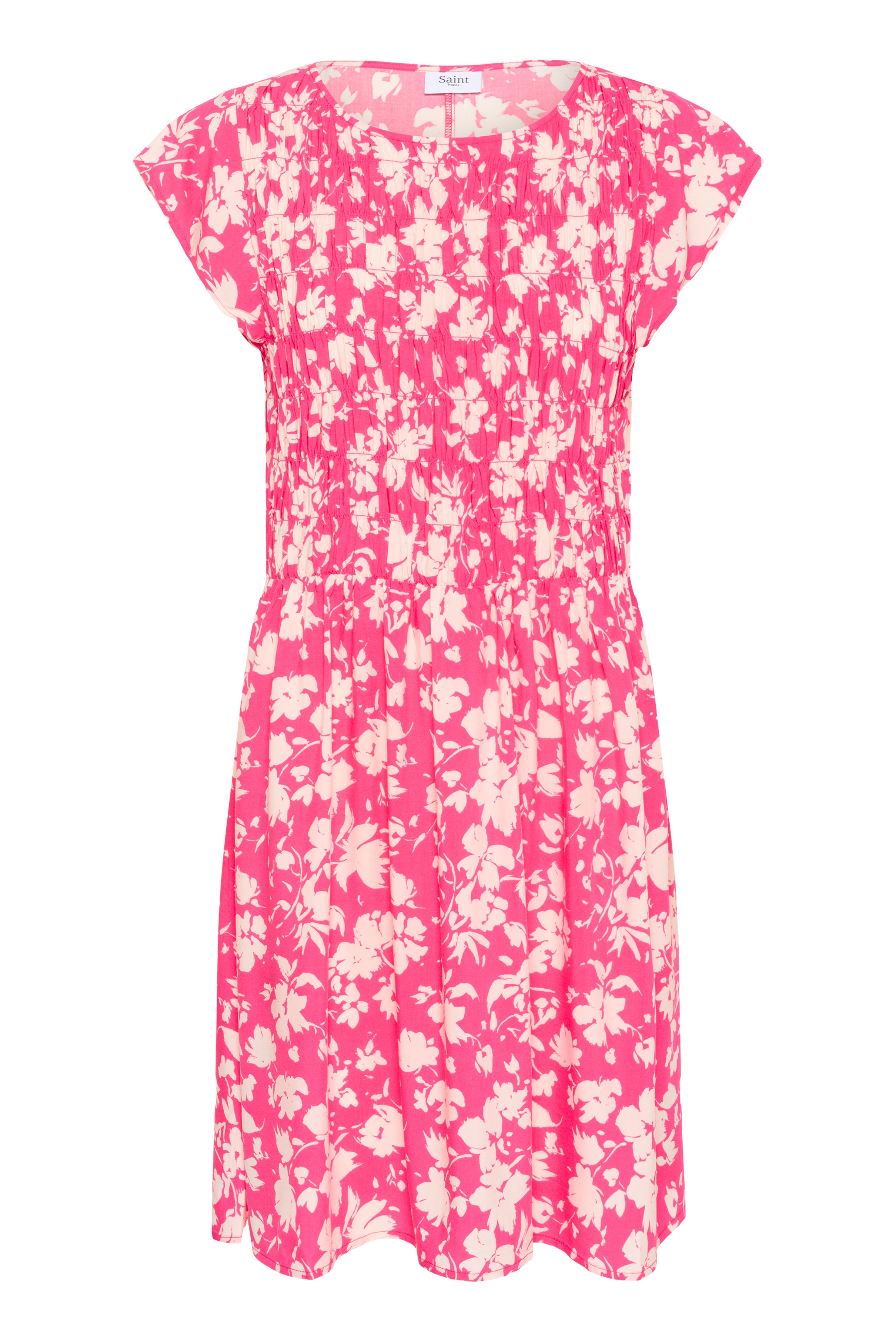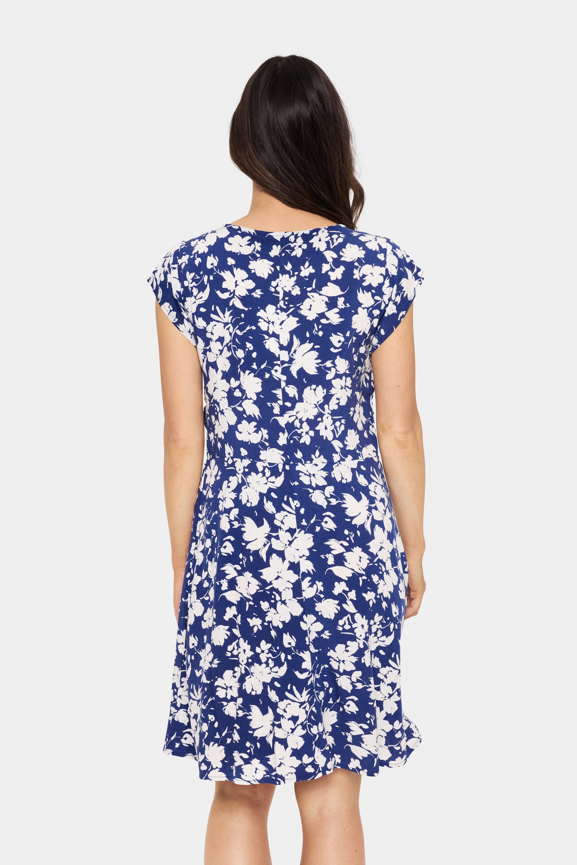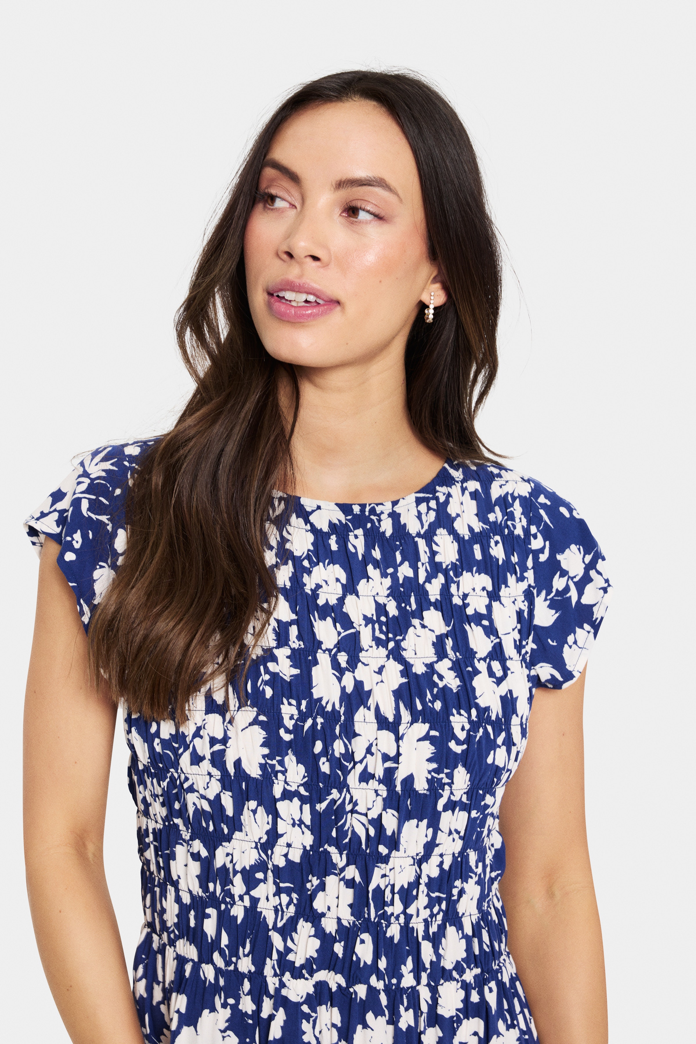 Knælang kjole i mørkeblå med cremefarvet blomsterprint over hele. Kjolen har korte, opskårne ærmer, rund hals og smocksyning i taljen for en markeret og behagelig pasform. Fremstillet i let vævet materiale. Modellen er 175 cm høj og bærer en størrelse S.