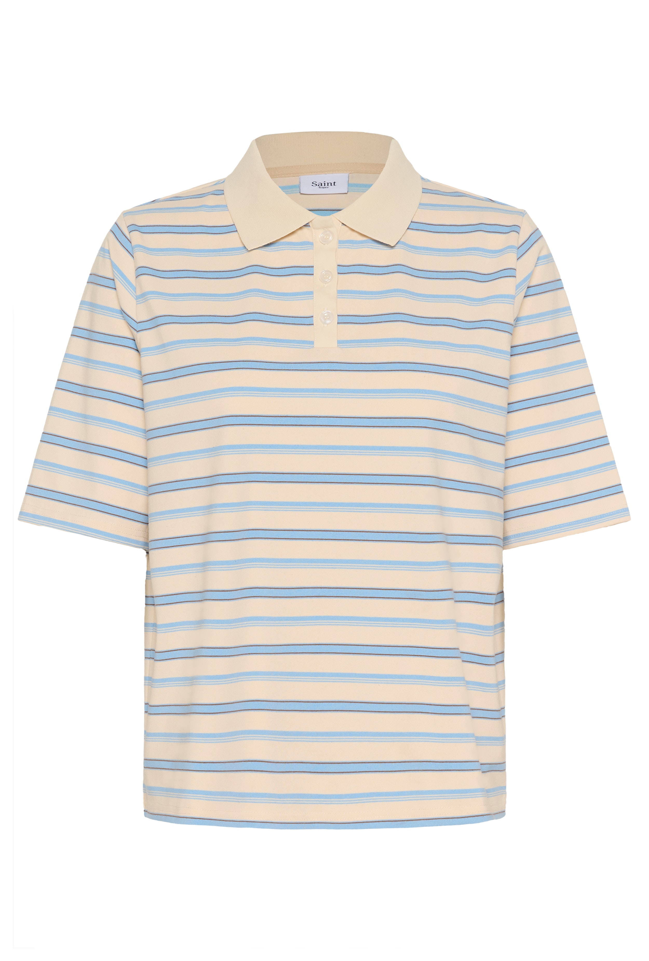 Polo T-shirt i cremefarve med vandrette striber i blå og gul. Har kontrastkrave i beige, korte ærmer og klassisk knaplukning. Fremstillet i blød jerseykvalitet med en afslappet pasform. Modellen er 175 cm høj og bærer en størrelse S.