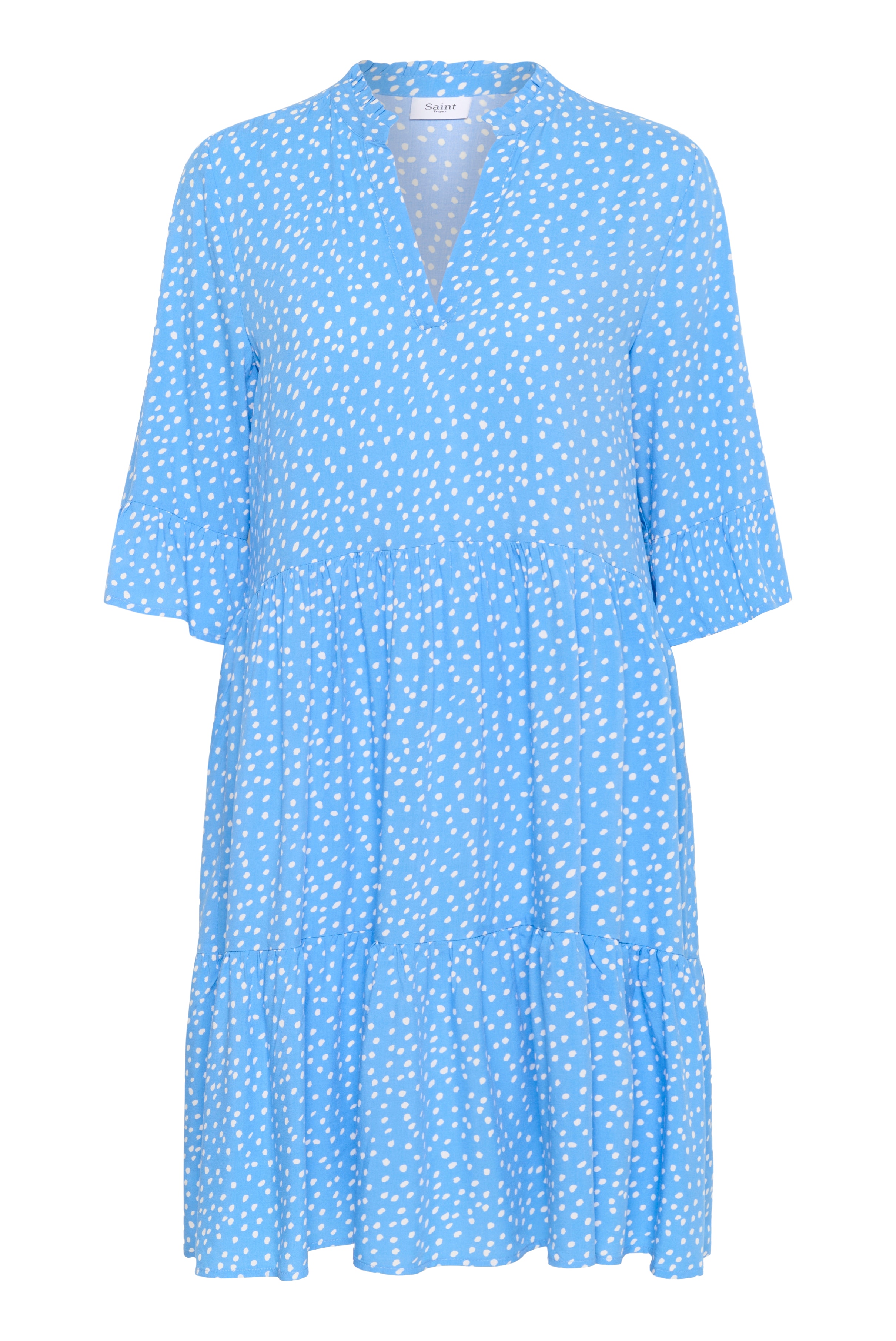 Kleid mit V-Ausschnitt, 3/4-Ärmeln mit Schnitt sowie Schnitt in der Taille und unten. Das Kleid hat eine lockere Passform und ist aus einem leicht gewebten Stoff gefertigt. Das Modell ist 177 cm groß und trägt die Größe M