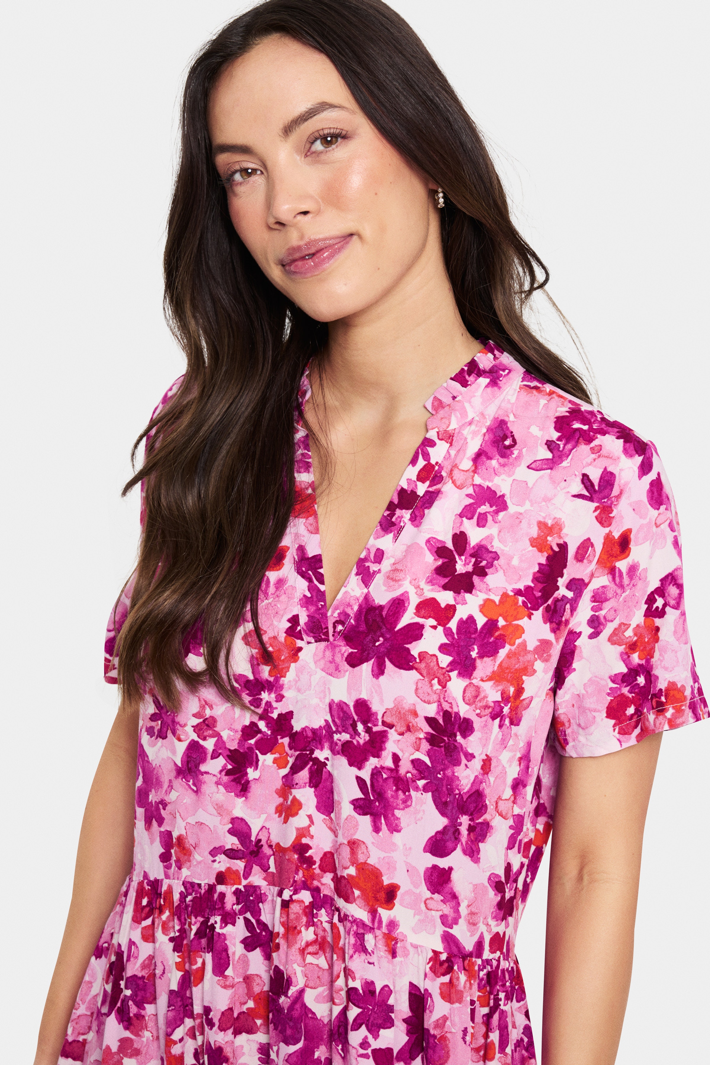 Midikleid in Pink mit durchgängigem Blumenmuster in Rot, Orange und Magenta. Mit Hemdkragen, kurzen Ärmeln und leicht ausgestelltem Rock für eine feminine, lockere Silhouette. Aus leichtem Webstoff gefertigt. Das Model ist 175 cm groß und trägt Größe S.