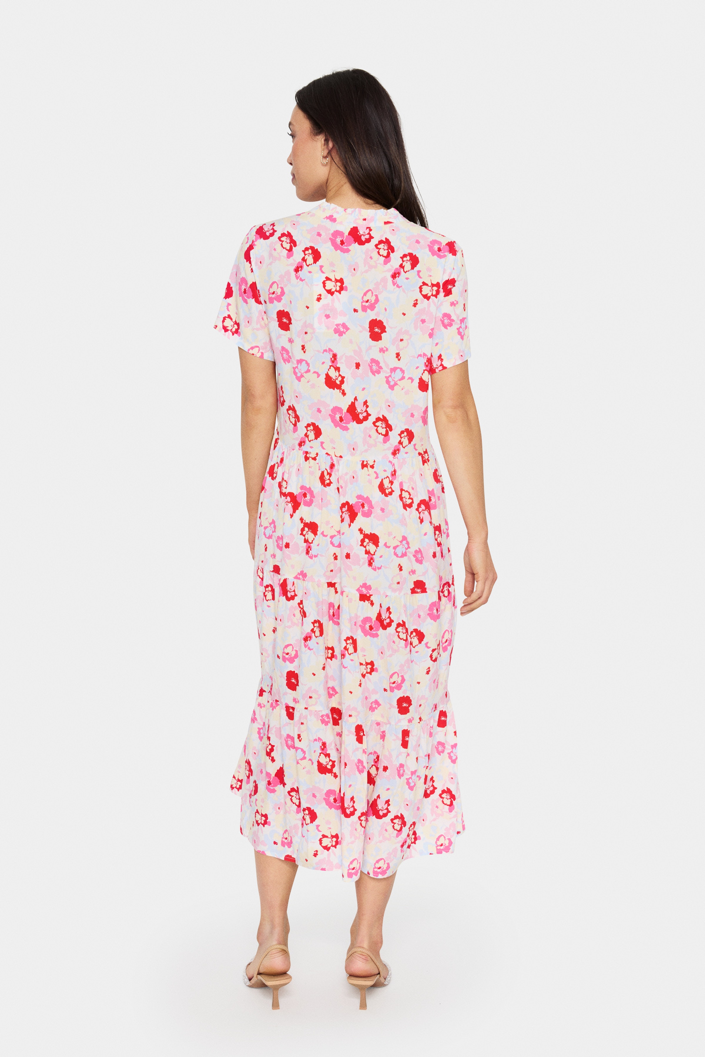 Maxikleid in Hellrosa mit durchgängigem Blumenmuster in Rot und Koralle. Mit Hemdkragen, kurzen Ärmeln und weich fallendem, ausgestelltem Maxirock für eine feminine Silhouette. Aus leichtem Webstoff gefertigt. Das Model ist 175 cm groß und trägt Größe S.