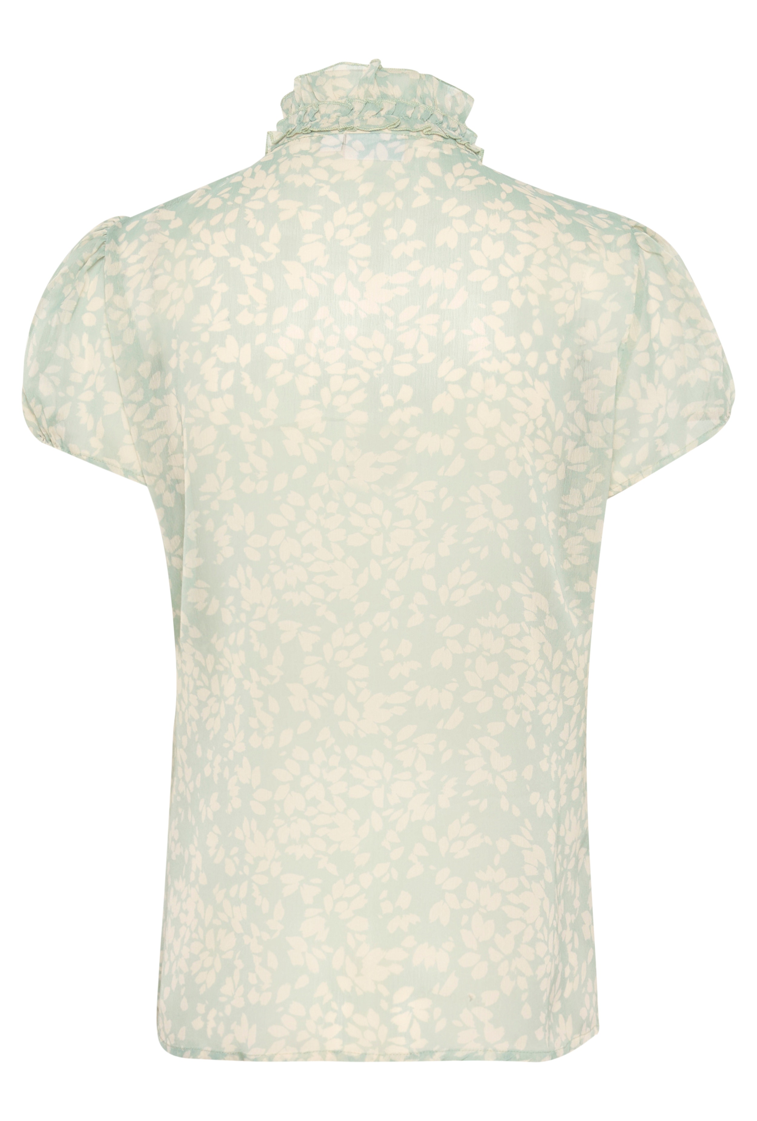 Hellgrüne Bluse mit zartem Blumenmuster. Mit kurzen Ärmeln und auffälliger Rüschenverzierung entlang der Vorderseite und am hohen Kragen. Aus leichtem, gewebtem Stoff mit femininer Silhouette. Das Model ist 175 cm groß und trägt Größe S.