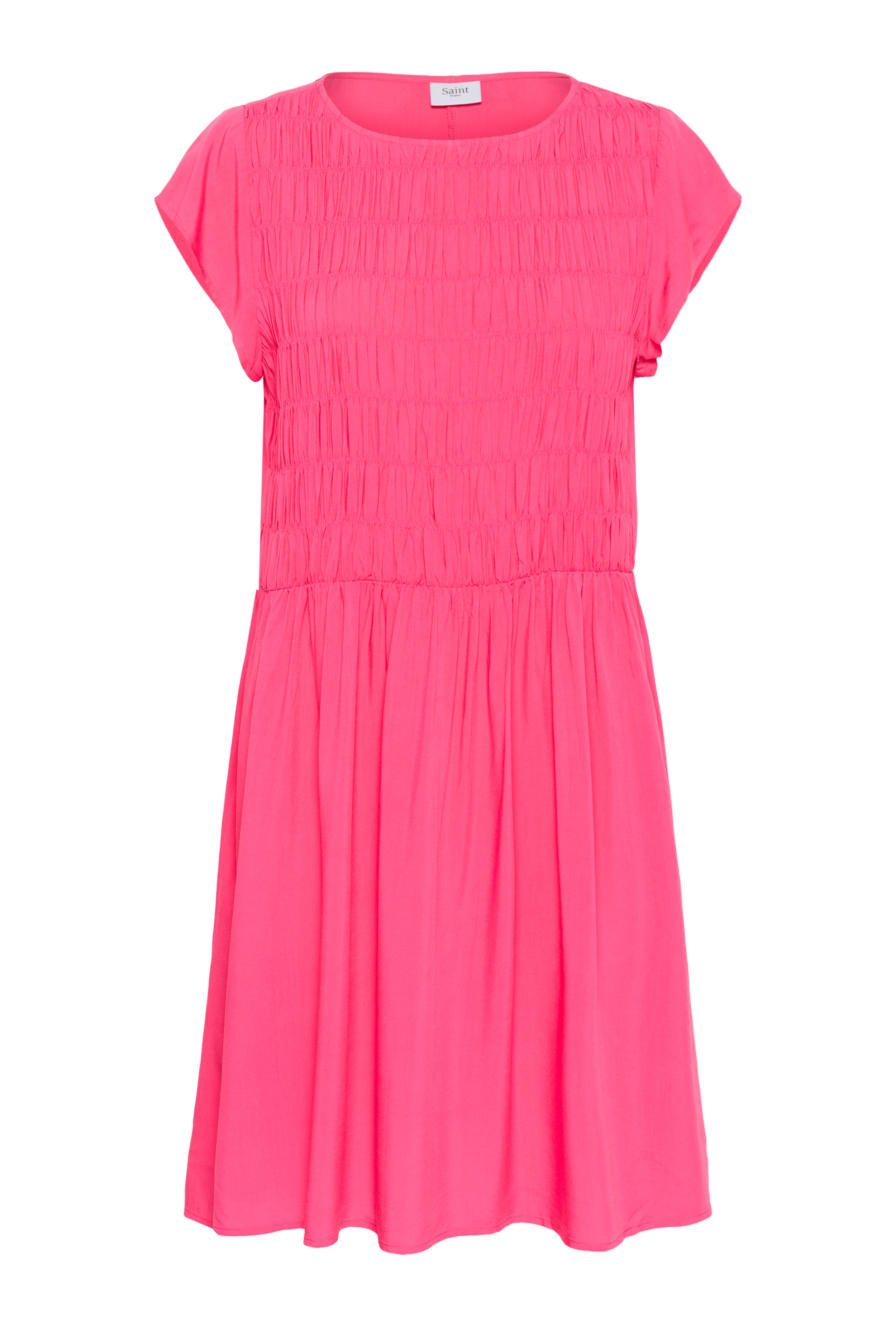 Kurzarmkleid in leuchtendem Pink mit Rundhalsausschnitt. Das Oberteil ist gesmokt für eine figurbetonte Passform, der Rock fällt locker. Gefertigt aus einem leichten, weich fallenden Stoff. Das Model ist 175 cm groß und trägt Größe S.