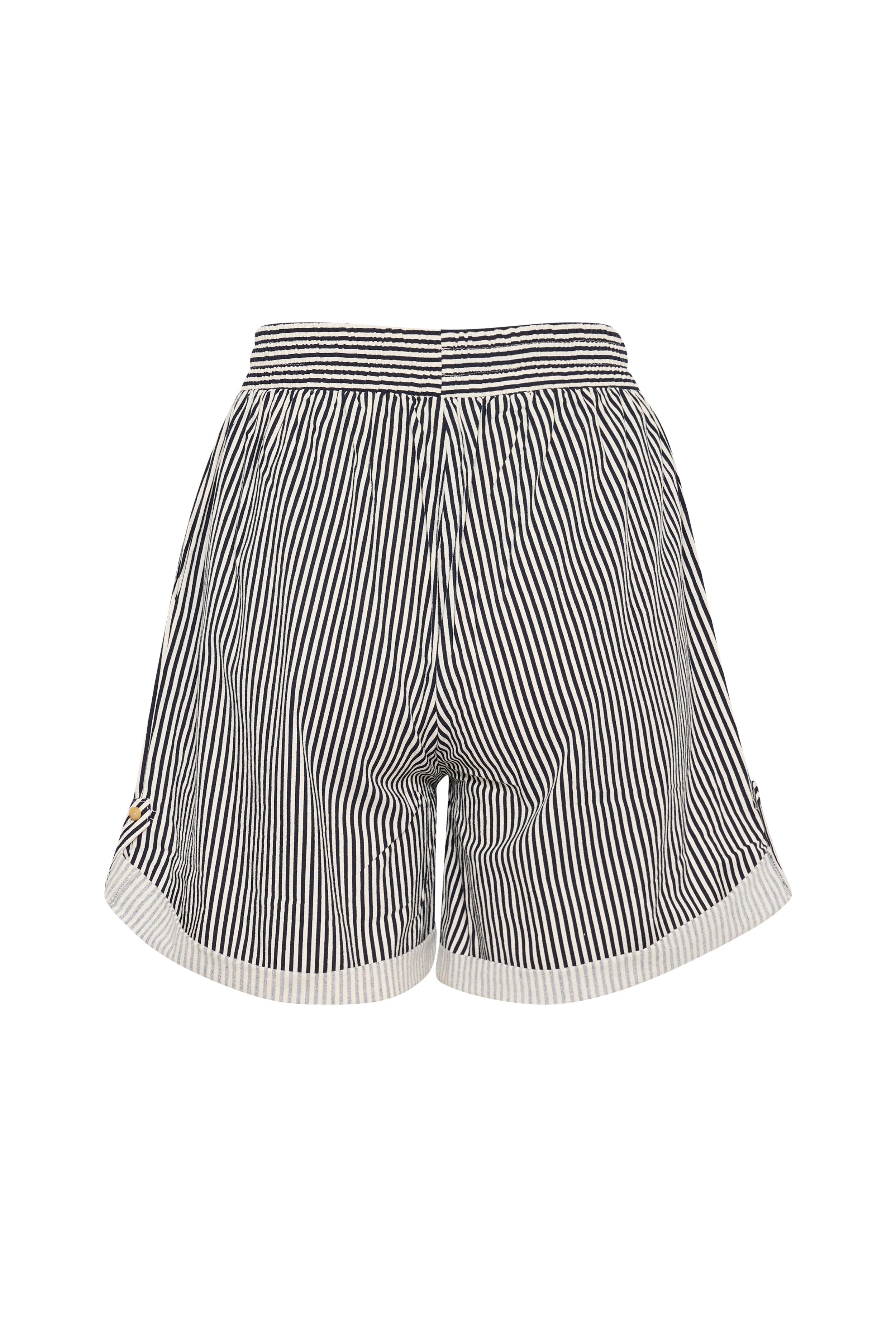 Shorts mit marineblau-weißen Streifen, elastischem Bund und Bindegürtel. Lockere Passform mit Seitentaschen und umgeschlagenem Saum. Das Model ist 176 cm groß und trägt Größe S.