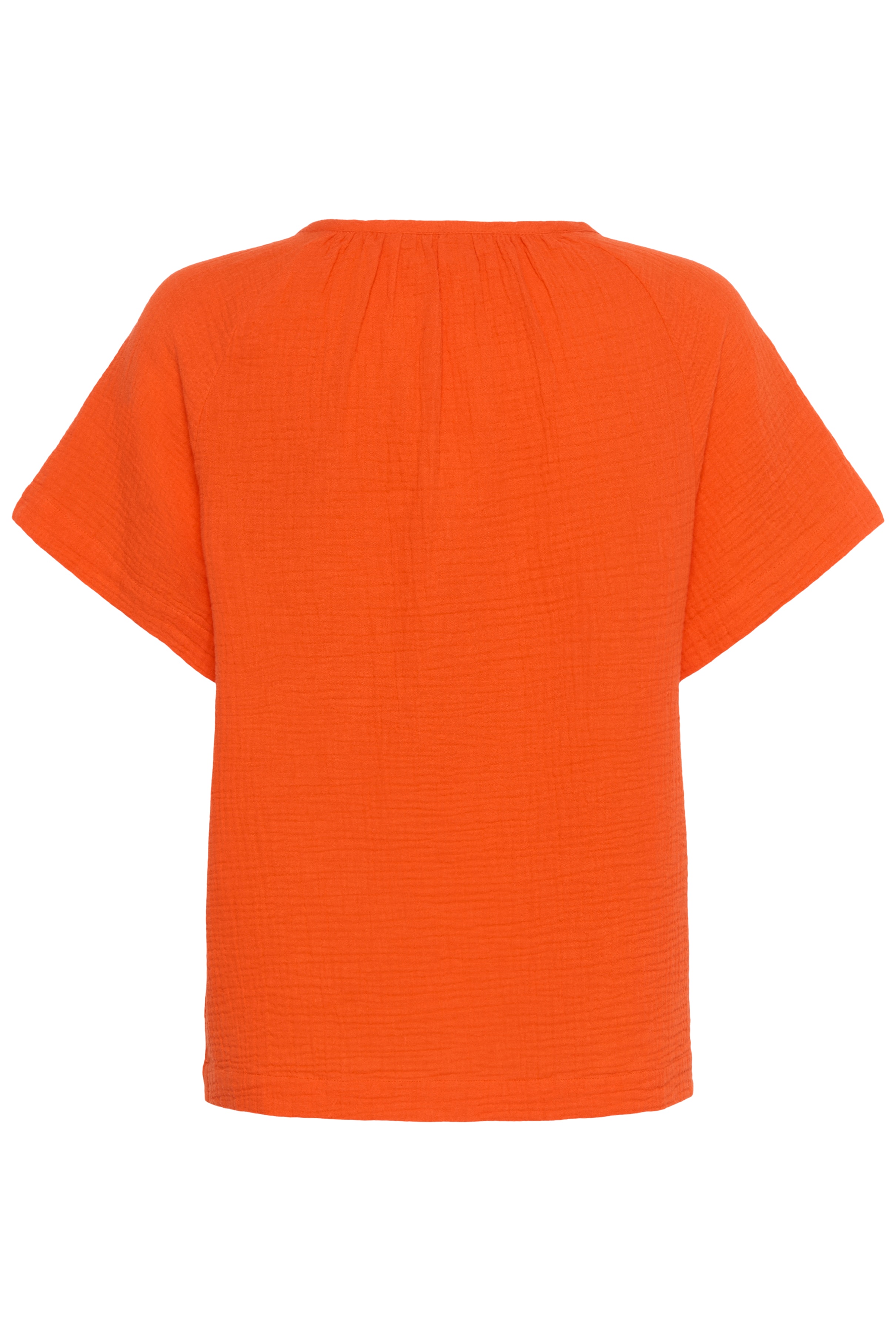 Short-sleeved blouse in a warm orange tone with a lightly crinkled texture. Features a round neckline with soft gathers and a relaxed silhouette. Made in a lightweight woven fabric for everyday comfort. The model is 179 cm tall and is wearing a size S.
