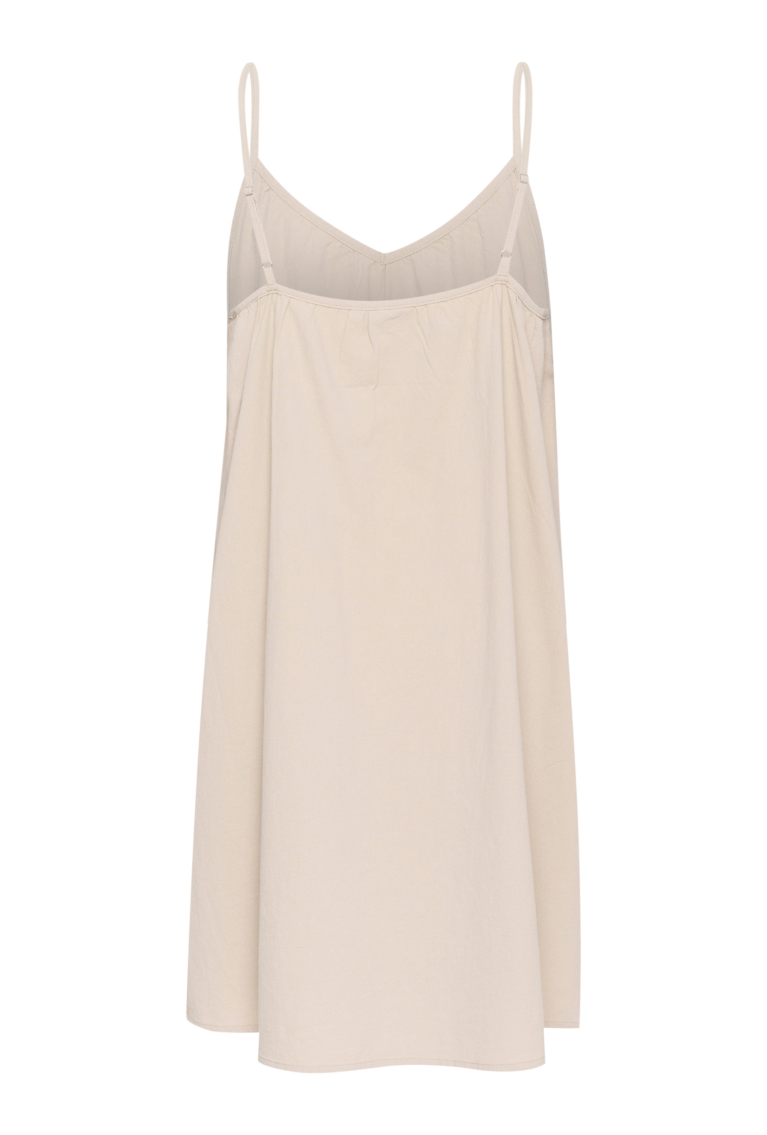 Beige hemdjurk met een rechte, losse pasvorm en verstelbare bandjes. Zachte plooi bij de halslijn en gemaakt van een lichte geweven stof met soepel vallende structuur. Het model is 176 cm lang en draagt maat S.