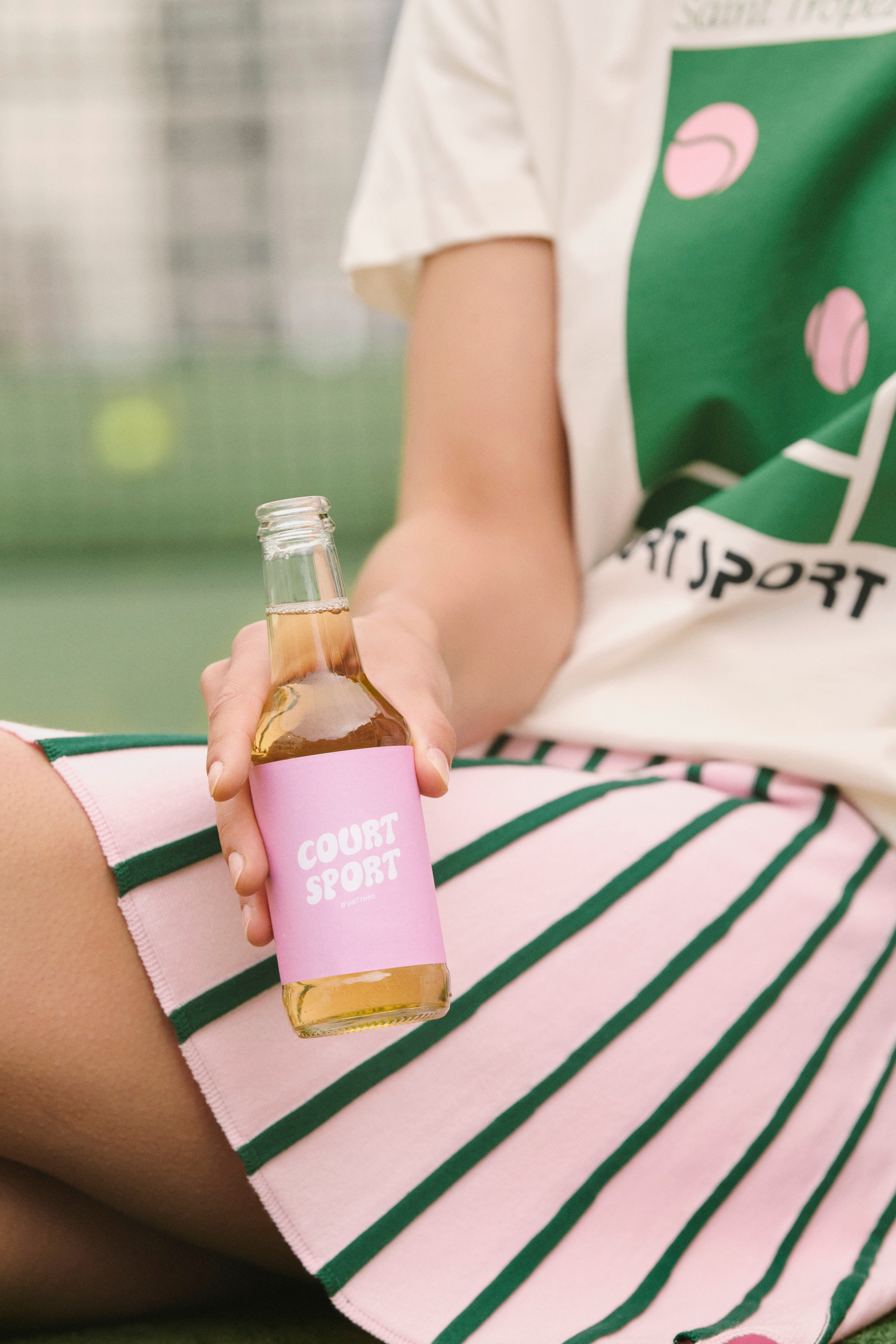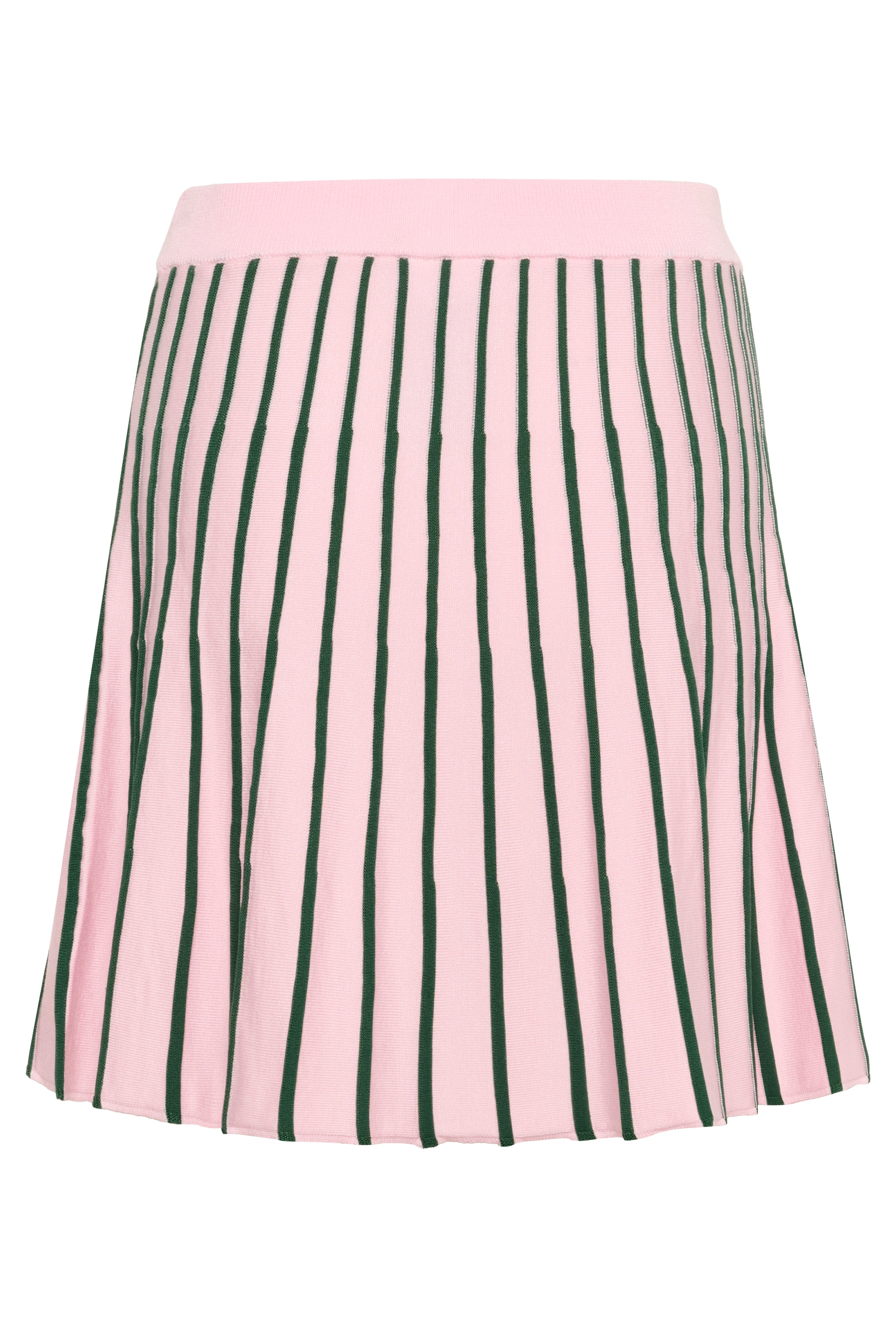 Stickad minikjol i ljusrosa med vertikala mörkgröna ränder. Har bred resårmidja och lätt utställd siluett. Tillverkad i mjuk, strukturerad stickning för komfort och form. Modellen är 175 cm lång och bär storlek S.