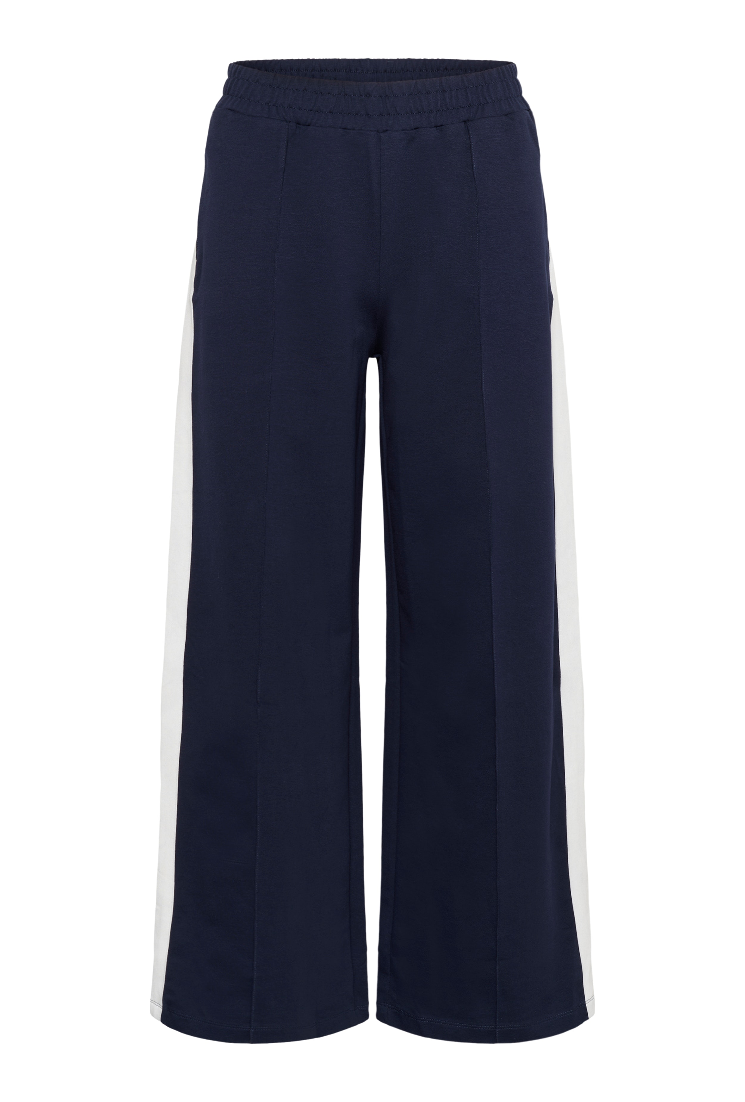 Jerseybyxor i marinblått med vida ben och offwhite sidopaneler. Designade med resårmidja, sidofickor och avslappnad passform. Tillverkade i mjukt material för en sportig och avslappnad stil. Modellen är 175 cm lång och bär storlek S.